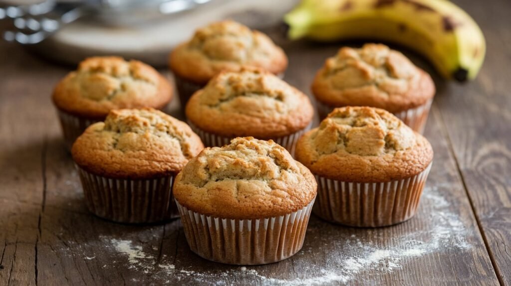 This recipe uses baking soda only, which reacts perfectly with the natural acidity in ripe bananas to give the muffins a soft, fluffy texture. As long as your bananas are ripe (the more brown spots, the better!), the rise will be just right. 😊🍌🧁