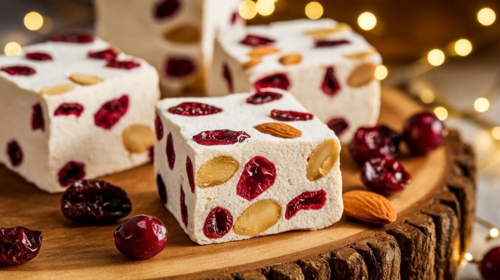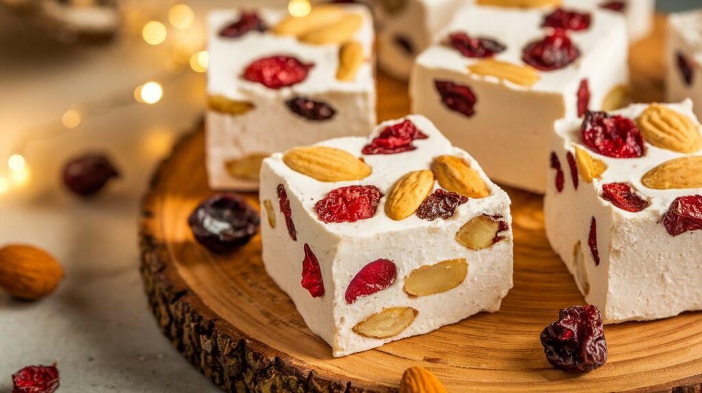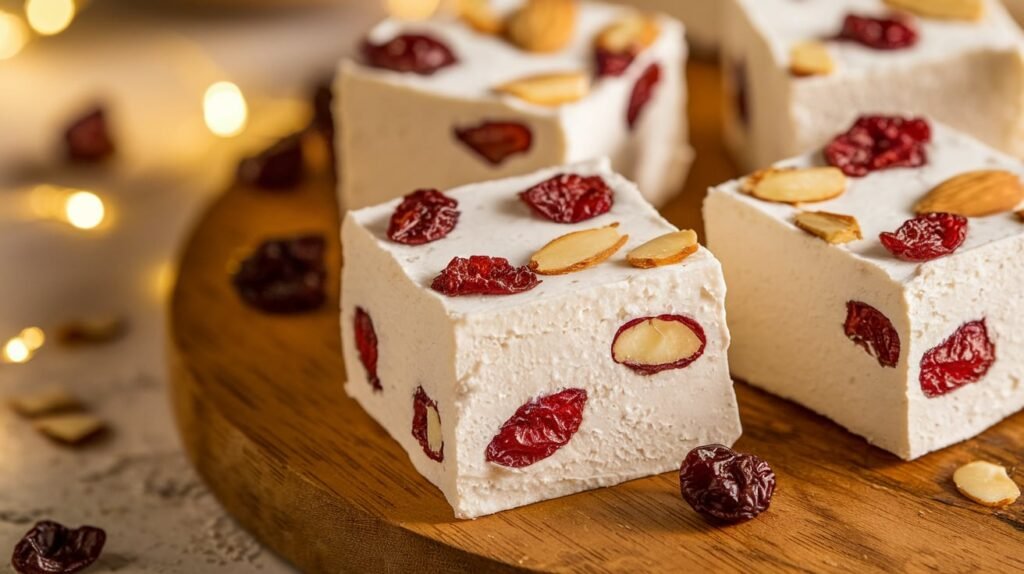 Chinese marshmallow nougat is a beloved treat that combines the chewy texture of nougat with the nutty crunch of almonds and the sweet, fruity zing of dried cranberries. This simple no-bake recipe has become increasingly popular, not only for its rich flavor but also for its ease of preparation. Perfect for holidays, parties, or even as an everyday snack, this nougat recipe will win over your family and friends.