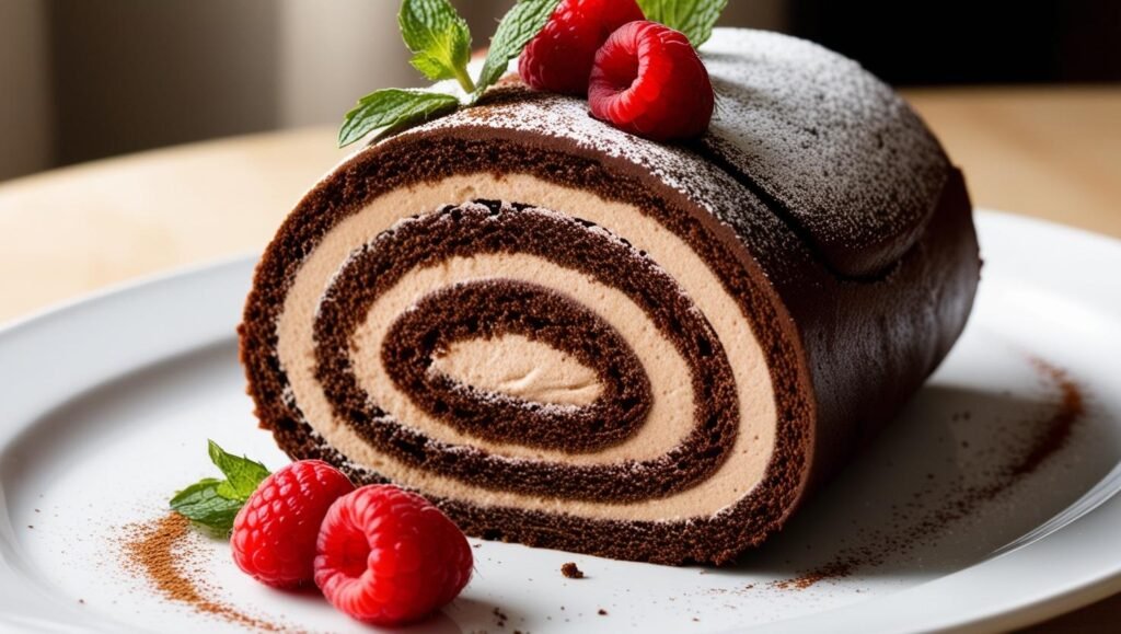 Imagine a swirl of rich chocolate cake rolled up with a creamy chocolate mousse filling. This Chocolate Swiss Roll is a classic dessert that never disappoints. The soft, airy sponge pairs beautifully with the rich, fluffy mousse to create a melt-in-your-mouth texture that’s pure indulgence. Garnished with fresh raspberries and mint leaves and dusted with cocoa powder, it’s as beautiful as it is delicious.