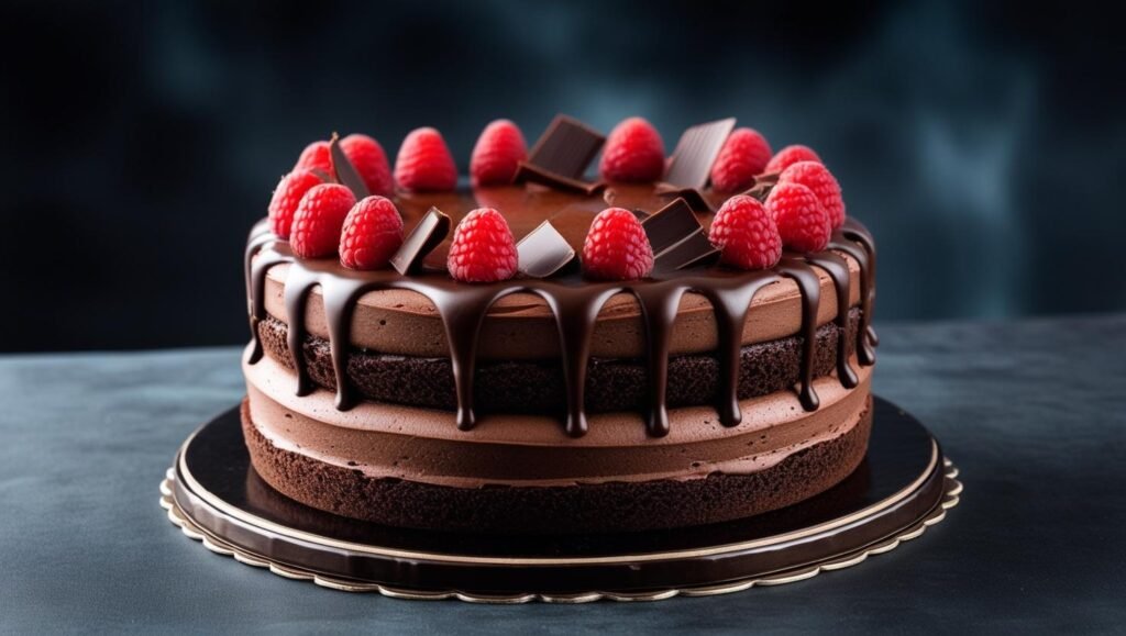 If you’re a chocolate lover, this double chocolate cake is a dream come true. With its rich, moist chocolate layers and smooth black velvet icing, this cake is the perfect indulgence for any occasion. The glossy ganache topping and delicate chocolate shavings add an elegant touch, making it an irresistible centerpiece. Paired with fresh raspberries, this cake balances deep chocolate flavors with a refreshing contrast.