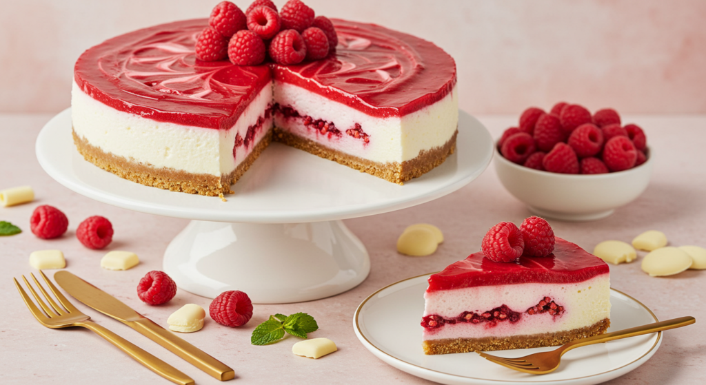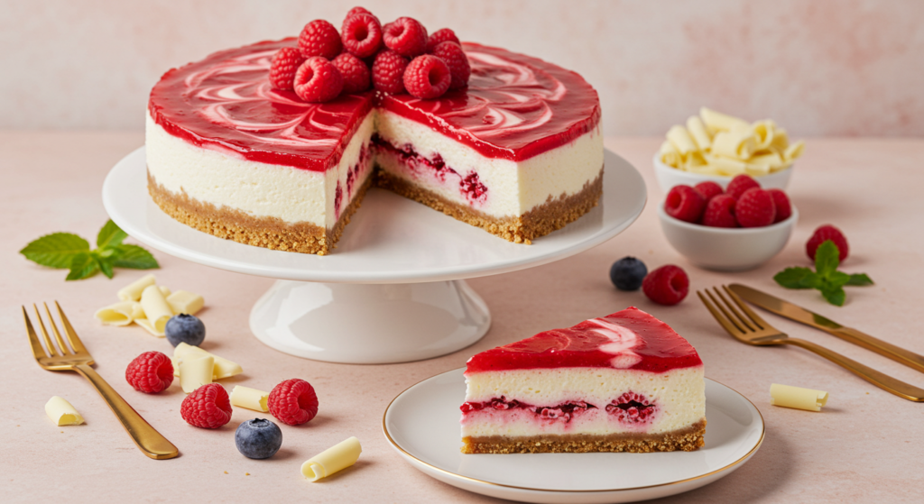 Once the cheesecake is set, spoon the cooled raspberry sauce over the top. Garnish with extra fresh raspberries, whipped cream, mint leaves, or white chocolate curls.