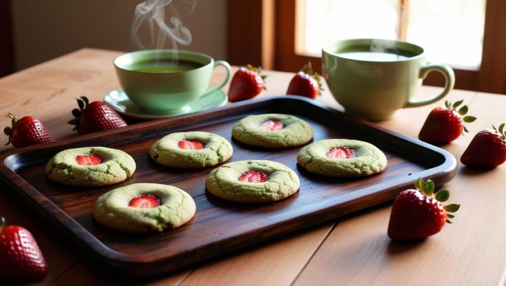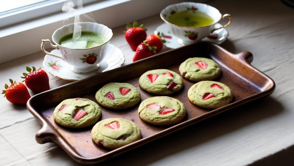 The vibrant green of matcha mixed with flecks of red strawberry makes these cookies pop visually, making them a perfect addition to any dessert table. Whether you’re hosting a tea party or just want a unique treat to enjoy with your afternoon latte, these cookies strike the perfect balance of sweet, fresh, and earthy.