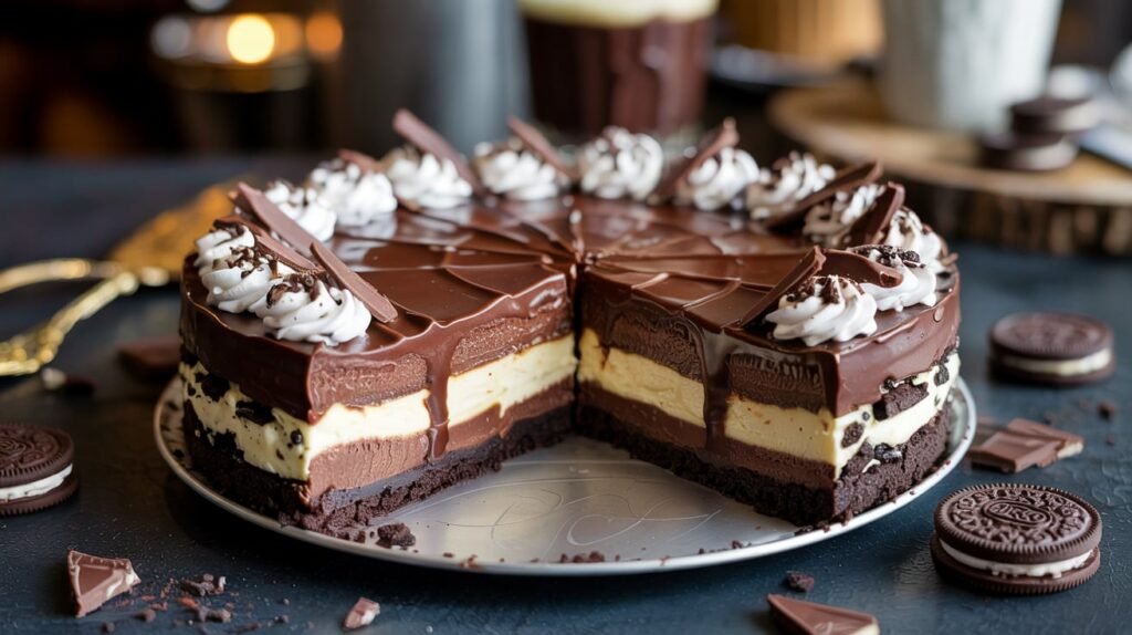 This cheesecake features three types of chocolate—dark, milk, and white—creating a harmonious blend of flavors. Each slice reveals a beautiful gradient of chocolate layers, topped with a glossy chocolate ganache. The finishing touch? A sprinkle of crushed Oreos and chocolate shavings for extra flair.